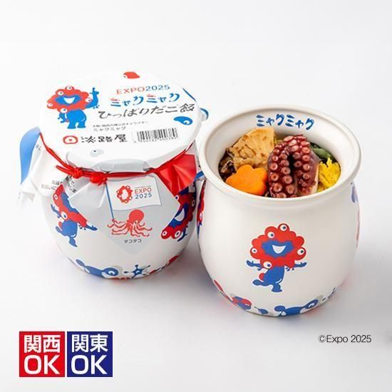 人気駅弁「ひっぱりだこ飯」の内容はそのままに、万博の公式キャラクター「ミャクミャク」があしらわれた特製デザインの陶器と掛け紙を採用した、公式ライセンス商品です。